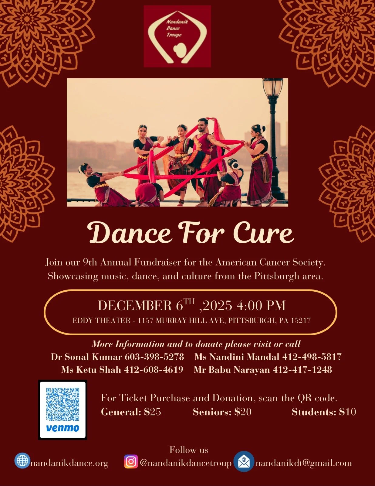 Nandanik Dance Troupe is hosting the 9th “Dance for Cure” event in Pittsburgh, PA, along with American Cancer Society, to honor cancer survivors and patients. We will donate up to seventy-five percent of the proceeds to American Cancer Society (ACS). Talented local dancers and musicians are coming together to present their art forms, all bound together with the goal of stomping cancer and celebrating the cultural diversity of Pittsburgh. Among the artists we have cancer survivors and those who have seen cancer affect a family or friend. Please join us to celebrate the special gift of life while pledging to eradicate cancer and support the care of those who need it most.